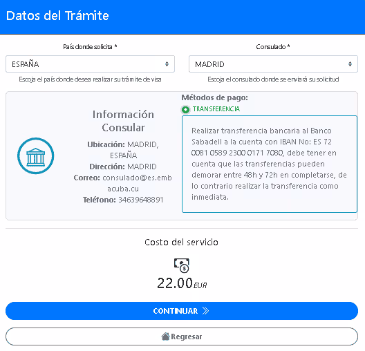 Para los visitantes españoles el métodos de pago es por transferencia bancaria al Banco Sabadell a la cuenta con IBAN No: ES 72 0081 0589 2300 0171 7080, debe tener en cuenta que las transferencias pueden demorar entre 48h y 72h en completarse, de lo contrario realizar la transferencia como inmediata, el costo del servicio es de 22.00 EUR.