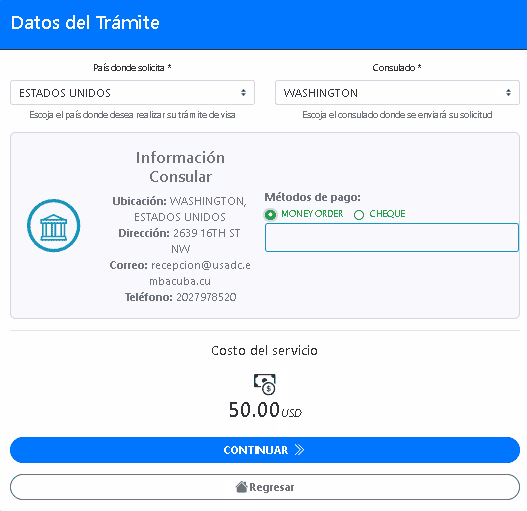 Por ejemplo para los solicitantes en Estados Unidos los métodos de pago son: MONEY ORDER o CHEQUE, y tiene un costo de 50.00 USD.
