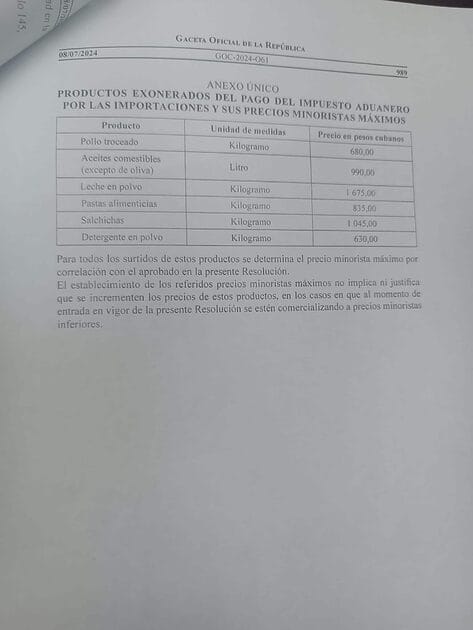 La información corresponde a una normativa publicada en la Gaceta Oficial de Cuba y su anexo único: “Productos exonerados del pago del impuesto aduanero por las importaciones y sus precios minoristas máximos”.