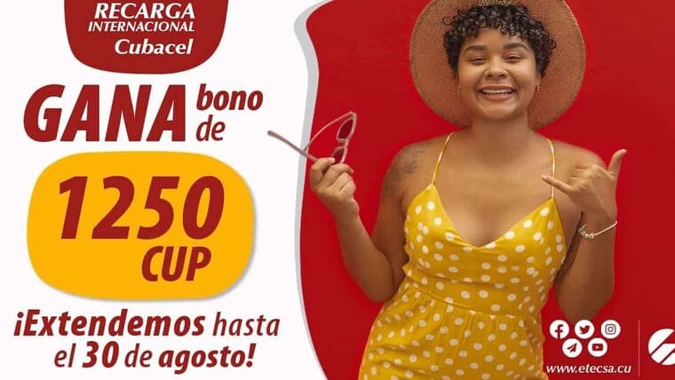 La Empresa de Telecomunicaciones de Cuba (ETECSA) informa la extensión hasta el 30 de agosto del 2021 de su promoción de recarga internacional “Gana Bono de 1250 CUP”.