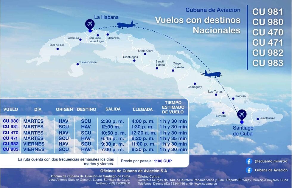 Los vuelos nacionales que conectan La Habana con Santiago de Cuba operarán dos veces por semana, los martes y viernes. El precio del pasaje para cualquiera de estas rutas es de 1100 CUP.