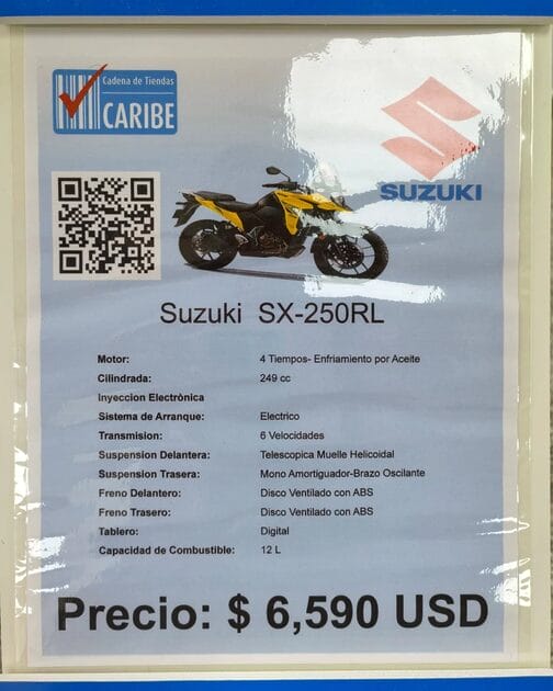 Entre los modelos que se ofertan, se encuentra la Suzuki SX-250RL, una moto de 4 tiempos y 249 cc, con transmisión de 6 velocidades, frenos ABS, tablero digital y capacidad de combustible de 12 litros. El precio de esta moto asciende a 6,590 USD, una cifra que ha provocado comentarios negativos en redes sociales. El usuario R. Santos ironizó: “¿Seis mil dólares una moto? Que van a comprar con todo ese dinero, ¿una termoeléctrica?”