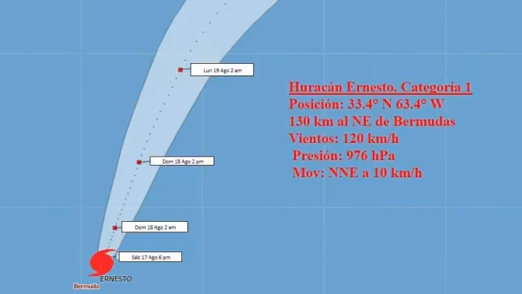 El Centro de Pronósticos del Insmet ha advertido en su parte correspondiente al 17 de agosto de 2024 que el huracán Ernesto se aleja de las Bermudas, en el Atlántico norte.