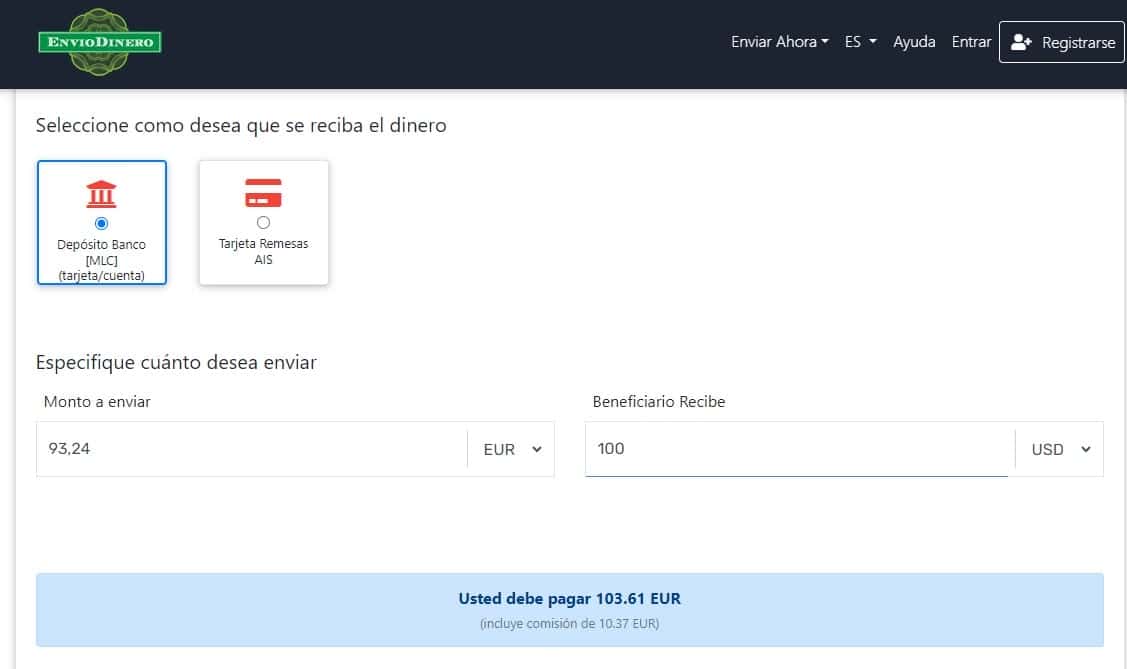 Directorio Cubano pudo comprobar que para que tu beneficiario reciba 100 MLC mediante enviodinero.com, por ejemplo, usted deberá pagar 103.61 EUR (incluye una comisión de 10.37 EUR). Observe en la imagen: