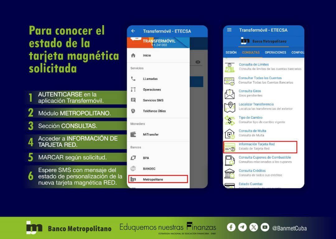 El Banco Metropolitano de La Habana informó los pasos que deben seguir los clientes para reimprimir su tarjeta magnética y conocer el estado del trámite a través de la aplicación Transfermóvil.