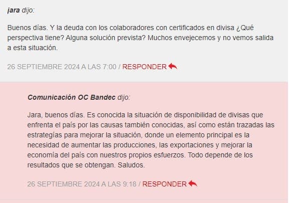 El debate también incluyó a colaboradores cubanos con certificados en divisa, quienes expresaron su preocupación por la deuda pendiente en USD. Uno de ellos, identificado como «JARA», preguntó si existía alguna solución prevista para esta situación.