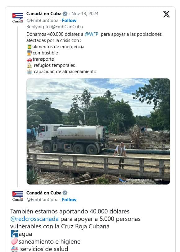 Así trascendió en mensaje de la embajada de Canadá en Cuba, el pasado 13 de noviembre, sobre la asignación de dos ayudas adicionales para atender las necesidades más urgentes de la población cubana.