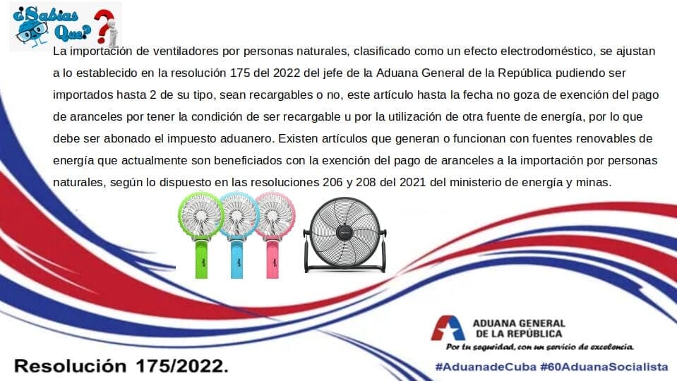 Para más información sobre la importación de ventiladores a Cuba, consulta la Resolución 175/2022 de la Aduana General de la República de Cuba o visita el sitio web de la Aduana: https://www.aduana.gob.cu/