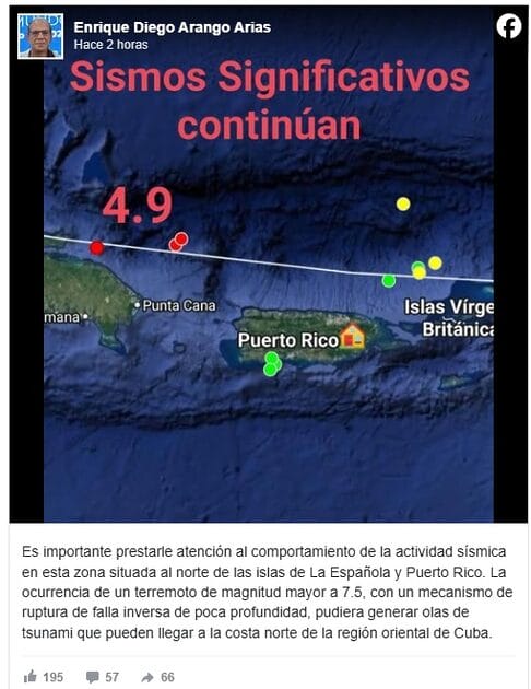 El jefe del Servicio Sismológico Nacional de Cuba, Enrique Diego Arango Arias, destacó la importancia de monitorear de cerca la actividad sísmica en esta zona debido a su proximidad a la falla de subducción ubicada en los 19° Norte. «La ocurrencia de un terremoto de magnitud mayor a 7.5, con un mecanismo de ruptura de falla inversa de poca profundidad, podría generar olas de tsunami que alcanzarían la costa norte de la región oriental de Cuba», advirtió el especialista.