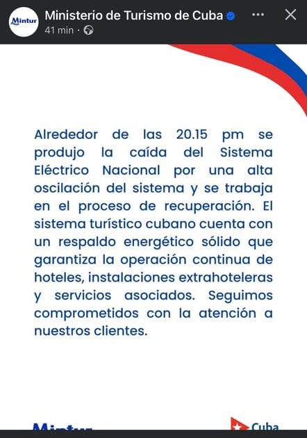 En su comunicado, el Ministerio de Turismo aseguró que “el sistema turístico cubano cuenta con un respaldo energético sólido que garantiza la operación continua de hoteles, instalaciones extrahoteleras y servicios asociados”.
