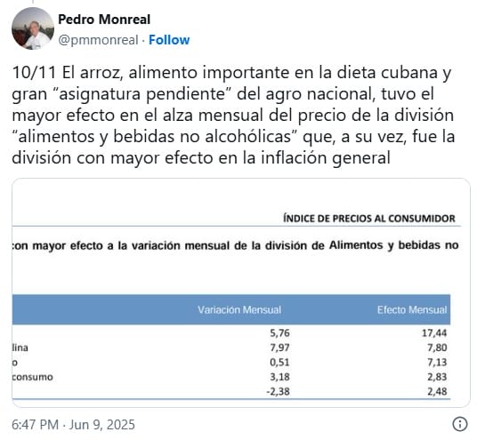 Según Monreal, aunque la inflación general en Cuba ha bajado en comparación con el año pasado —pasó de 31,11% en mayo de 2024 a 16,43% en mayo de 2025—, el alza de los precios de los alimentos sigue siendo preocupante. “El arroz […] tuvo el mayor efecto en el alza mensual del precio de la división ‘alimentos y bebidas no alcohólicas’”, explicó en una serie de mensajes publicados en su cuenta de X.