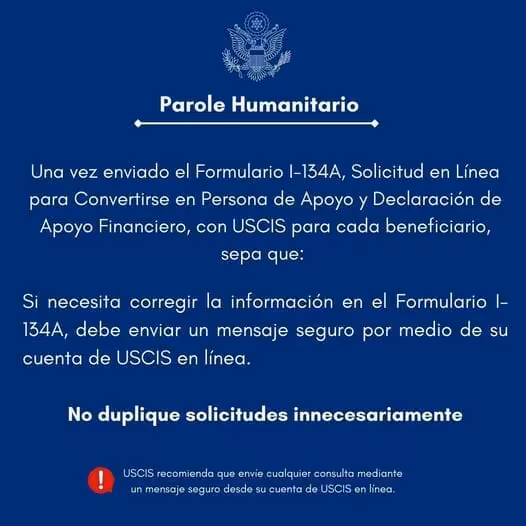 Una vez enviado el Formulario 1-134A, si necesita corregir la información presentada, debe enviar un mensaje seguro por medio de su cuenta de USCIS en línea, agregan.