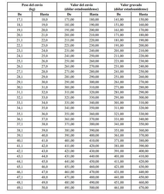 Por el peso o valor que supere los 30 USD o 3 kg, y hasta un límite de 200 USD o 20 kg, se aplica un 30 % de tarifa arancelaria.