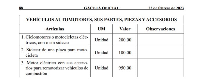 Una norma de la Aduana General de la República, publicada en la Gaceta Oficial No. 16 Extraordinaria de 2023 de Cuba, autoriza la importación de ciclomotores o motocicletas eléctricas, así como de motores eléctricos y sus accesorios.