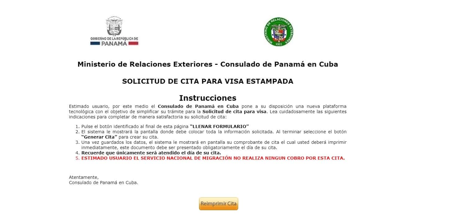 La página de solicitud de visa estampada para Panamá contiene las siguientes instrucciones: