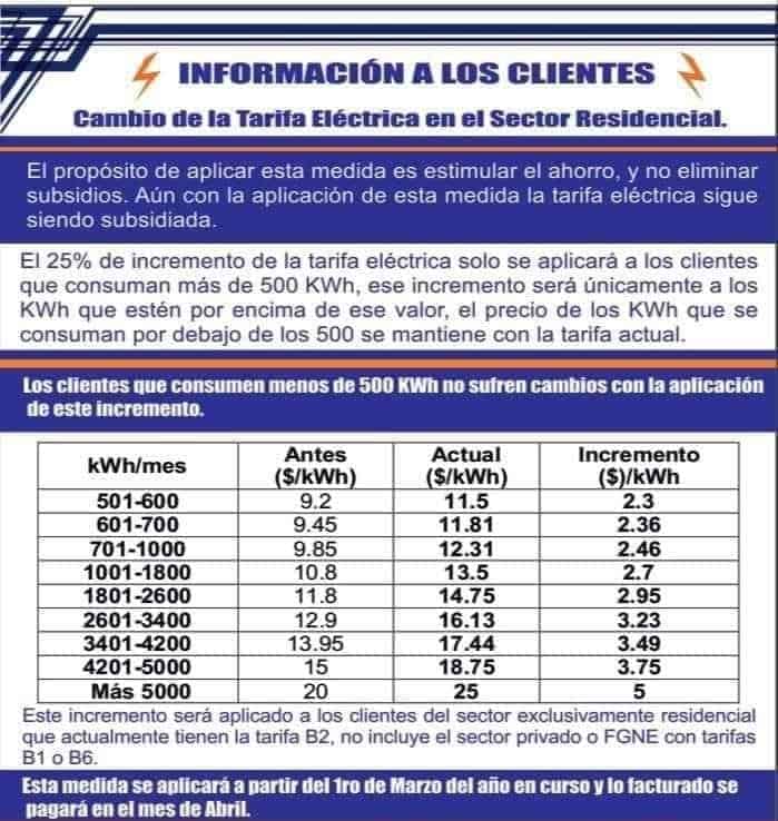 Inicialmente, señalaron que “el 25% de incremento de la tarifa eléctrica solo se aplicará a los clientes que consuman más de 500 KWh en Cuba”.