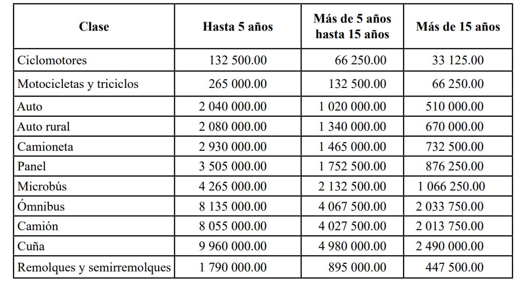 esa tabla de precios se refiere al valor mínimo del vehículo según su edad y tipo. Entonces cuál es el importe final para realizar un traspaso de vehicular entre personas naturales?