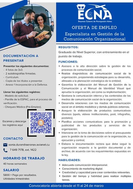 Oportunidades laborales de la Empresa Cubana de Navegación Aérea (ECNA). Se buscan trabajadores para los puestos de Especialista en Comunicación Organizacional y Técnico de Clima y Refrigeración. ¡Conoce los requisitos y cómo aplicar!