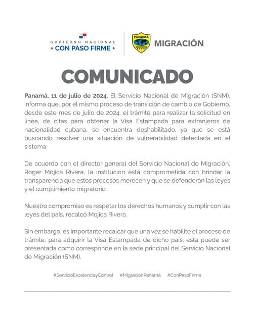 El Servicio Nacional de Migración (SNM), informa que, por el mismo proceso de transición de cambio de Gobierno, desde este mes de julio de 2024, el trámite para realizar la solicitud en línea, de citas para obtener la Visa Estampada para extranjeros de nacionalidad cubana, se encuentra deshabilitado, ya que se está buscando resolver una situación de vulnerabilidad detectada en el sistema.