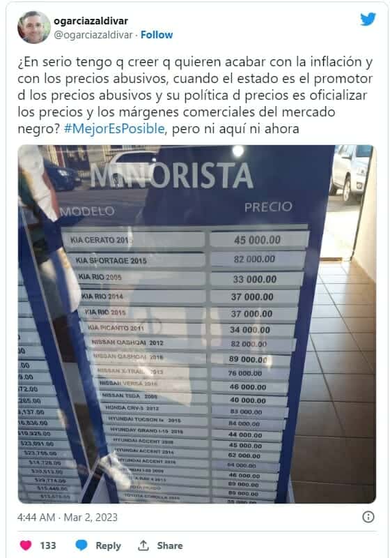 El profesor Osmani García Zaldívar publicó la mencionada lista en Twitter, que muestra algunos de los escandalosos precios de los autos en un local de La Habana.