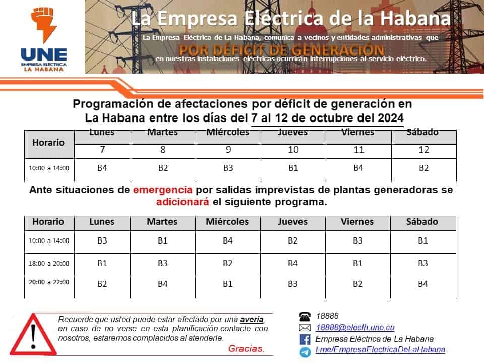 La Empresa Eléctrica de La Habana ha publicado el calendario de afectaciones al servicio eléctrico para la semana del 7 al 12 de octubre de 2024 debido al déficit de capacidad de generación en el país.
