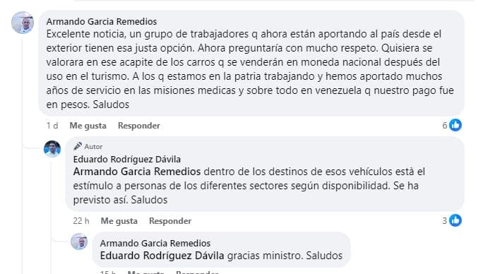Al respecto, un usuario pidió en Facebook: «quisiera se valorara en ese acápite de los carros que se venderán en moneda nacional a los que estamos en la Patria trabajando y hemos aportado muchos años de servicio en las misiones médicas, sobre todo en Venezuela, que nuestro pago fue en pesos».