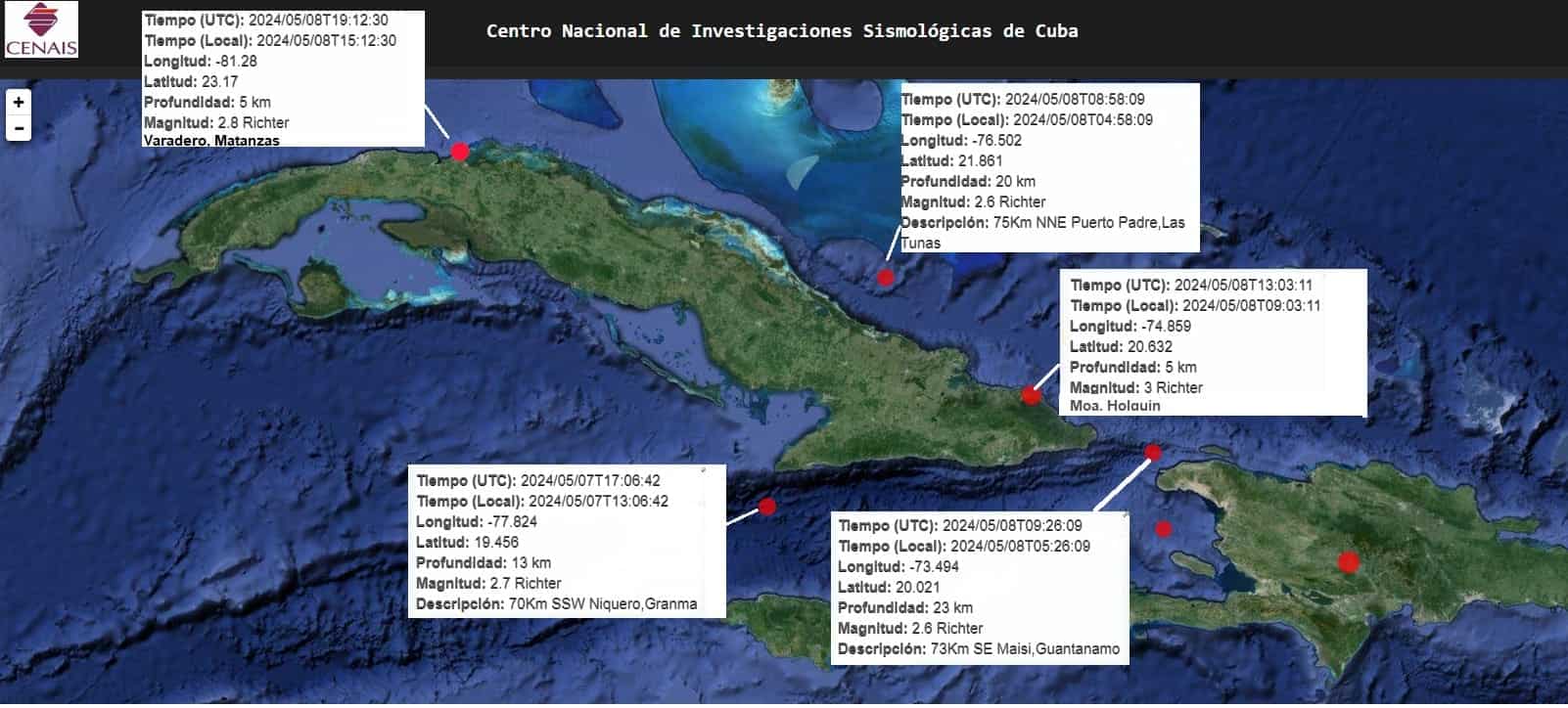 La red de estaciones del Servicio Sismológico Nacional Cubano informó sobre el registro de un sismo perceptible a las 09:13 am de este 8 de mayo de 2024, ubicado a 5.0 km al este sureste de Moa, Holguín.