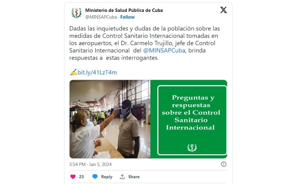 El Ministerio de Salud Pública de Cuba (MINSAP) publicó una información actualizada sobre el control sanitario en los aeropuertos cubanos y en la isla.