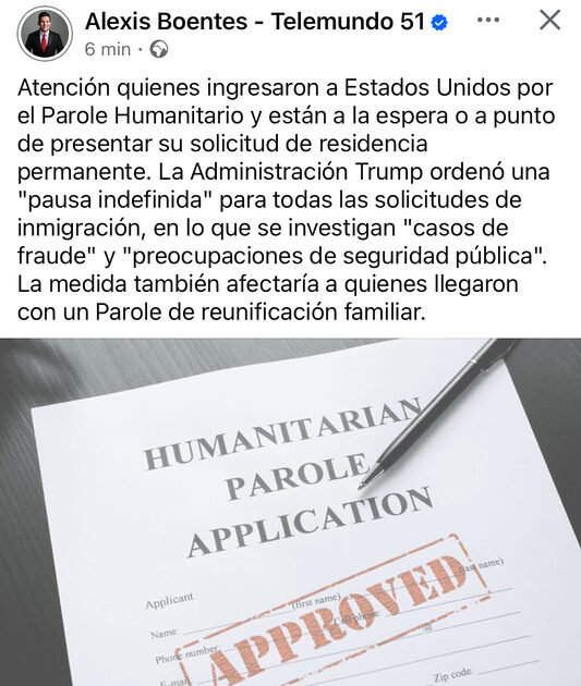 De acuerdo con un memorando interno, revisado por CBS News y fuentes de Martí Noticias que citó el periodista Mario J. Pentón, las solicitudes presentadas por beneficiarios del programa de parole humanitario y el programa Unidos por Ucrania están en pausa administrativa. «El 14 de febrero se ordenó esta pausa administrativa en todas las agencias de inmigración de los Estados Unidos sobre solicitudes de beneficios pendientes», indica el documento.