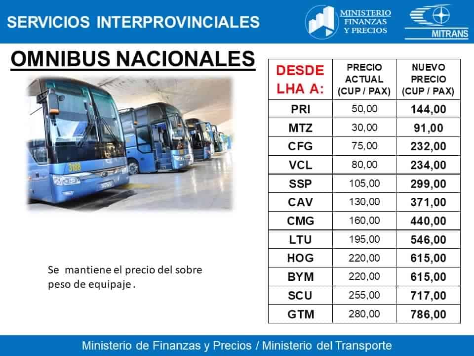 PRECIOS APROBADOS PARA LOS VIAJES INTERPROVINCIALES EN ÓMNIBUS EN CUBA