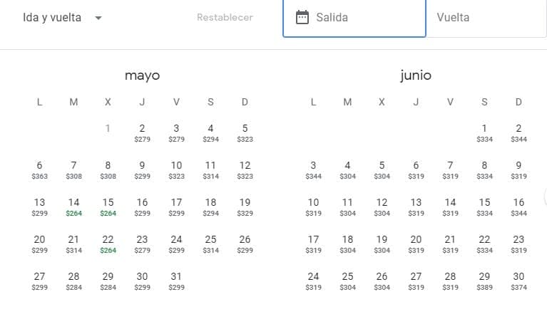 -En mayo el precio más bajo es de $264 en las fechas del 14, 15 y 22 de mayo.