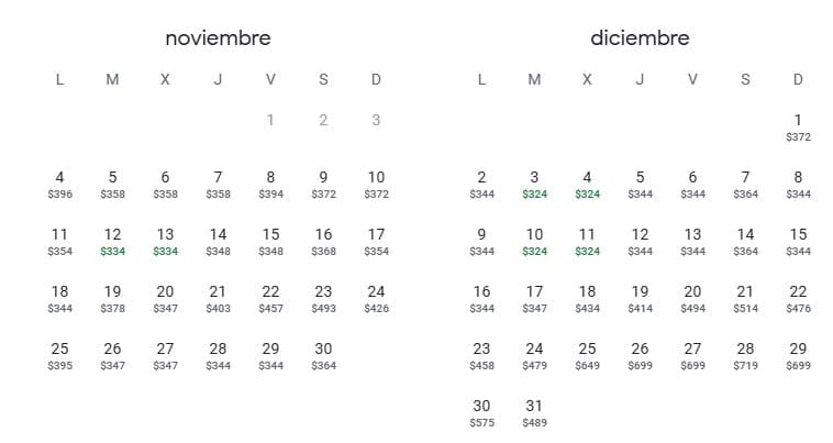 - Los precios más económicos son el 12 y 13 de noviembre, con tarifas de 334 USD.