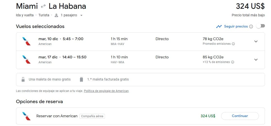 Vuelta: Martes, 17 de diciembre, saliendo a las 2:40 pm desde La Habana y llegando a Miami a las 3:50 pm. Duración: 1 hora y 10 minutos.