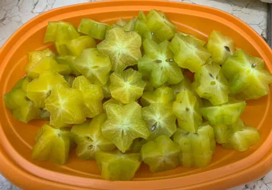 La otra invitada del día tiene varios nombres: carambola, ciruela china, o “fruta estrella”, entre otros varios. La verdad es que es bien exótica. Luce como una estrella tridimensional de cinco puntas. Su pulpa es jugosa, un tanto fibrosa, y ácida. Podemos consumirla cruda y cocida.