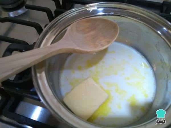 - En una olla al fuego vertemos la leche, y añadimos la mantequilla. Calentamos sin dejar de remover por aproximadamente 5 minutos. Sobre todo, no debemos dejar hervir.