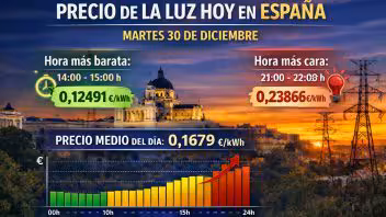 El precio de la luz registra este martes 30 de diciembre un cambio relevante en España, con una bajada del coste medio diario y una diferencia clara entre las horas más baratas del día y los tramos más caros de la noche. La jornada ofrece varias ventanas favorables para el consumo doméstico, especialmente en horas centrales.