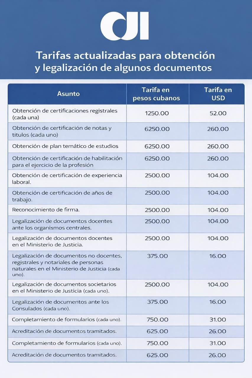 El cambio impacta a quienes necesitan trámites legales, sobre todo para usar documentos en el extranjero. Las tarifas se fijan en pesos cubanos y también en dólares.