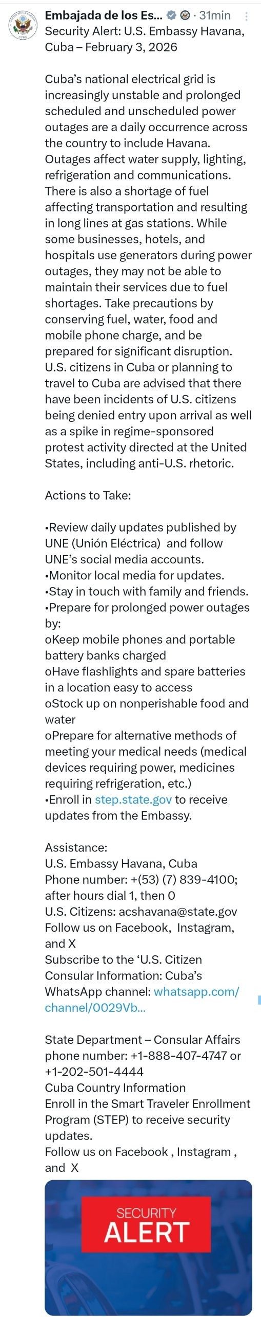 La Embajada de Estados Unidos en La Habana emitió una alerta de seguridad más amplia sobre la situación que atraviesa Cuba, marcada por apagones diarios, escasez de combustible y un entorno político cada vez más tenso para los ciudadanos estadounidenses.