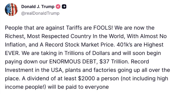 En la misma publicación, aseguró que los planes de pensiones 401(k) “están en su nivel más alto” y que el país “pronto” empezará a pagar su deuda gracias a lo recaudado. Como culminación, anunció el pago masivo: “Se pagará un dividendo de al menos 2000 dólares por persona (¡sin incluir a las personas con altos ingresos!) a todo el mundo”.